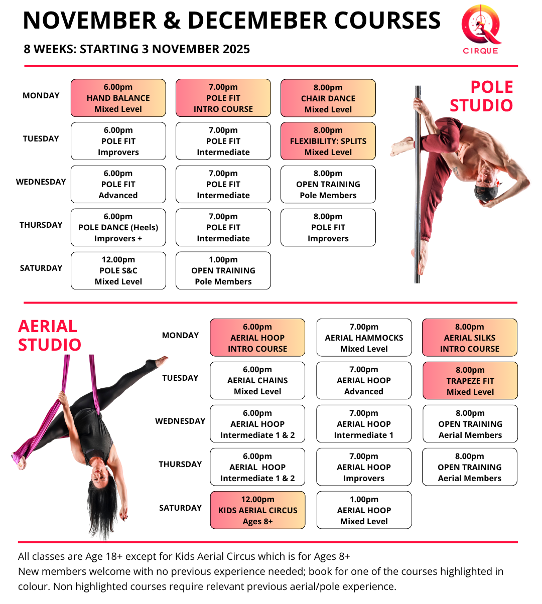 Our adult classes are for ages 18+. We have dedicated Aerial classes for Kids Ages 7-11 and Teens Ages 11-17. Other than that there's no restrictions regarding age, gender, size, shape, strength, flexibility, fitness level, etc.